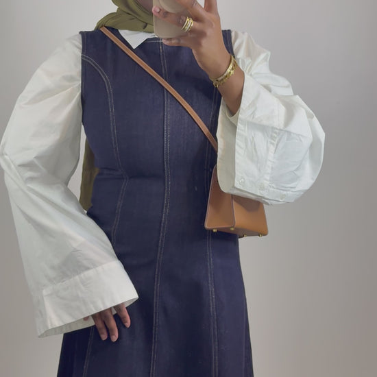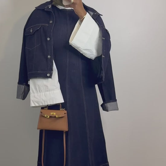 Robe en jean bleu denim, à la coupe droite et moderne.